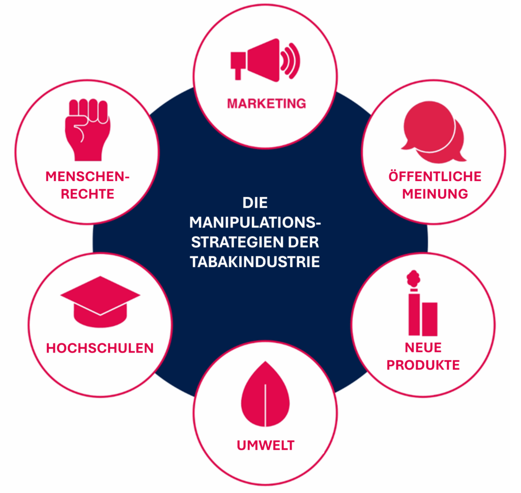 Die Tabakindustrie verfolgt weltweit eine komplexe Strategie der Manipulation, mit dem Ziel, ihre gesundheitsgefährdenden Produkte zu vermarkten und ihre Gewinne zu maximieren – oft auf Kosten der öffentlichen Gesundheit. Ihre Taktiken sind zahlreich, gut koordiniert und häufig schwer zu durchschauen. Transparency and Truth analysiert diese Strategien auf Basis aktueller Evidenz, um eine informierte und faktenbasierte öffentliche Debatte zu fördern. In der Schweiz zeigt sich der Einfluss der Industrie vor allem entlang von sechs zentralen strategischen Achsen: